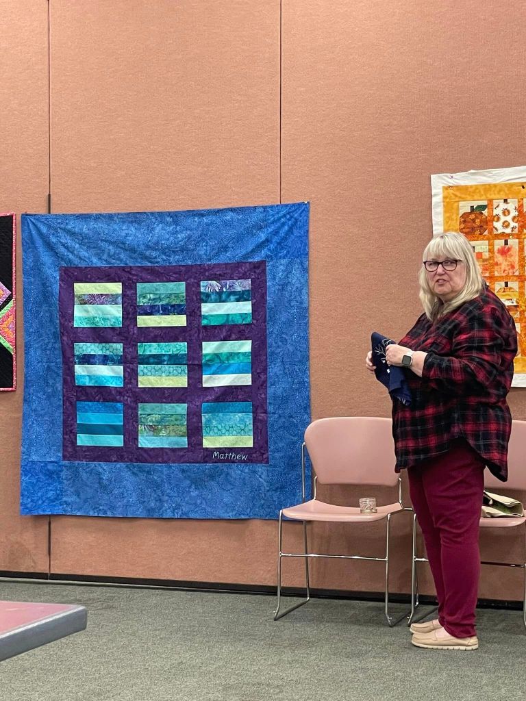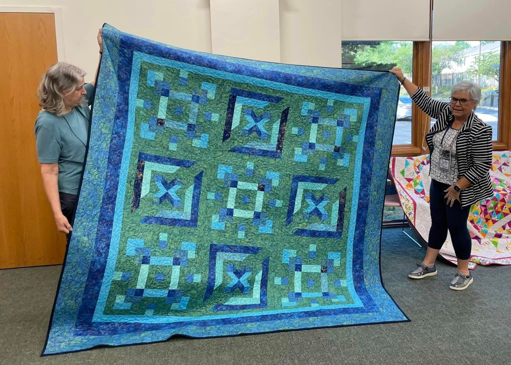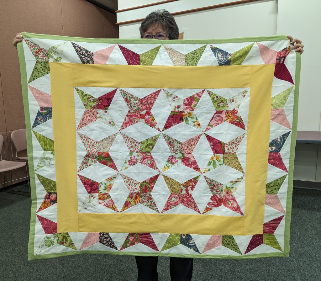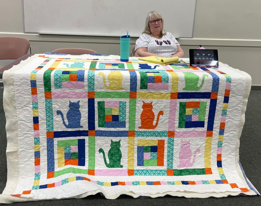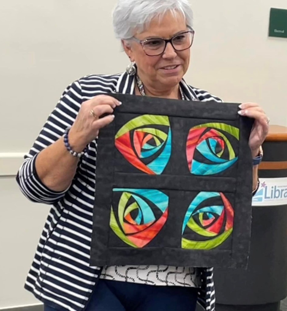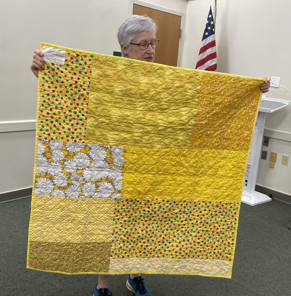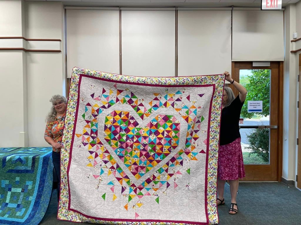At the August meeting, we shared the quilt that we’ll be raffling at the Expo show. Thanks to everyone who made this happen: guild members who voted for the Eudaimonia quilt pattern, everyone who helped put it together, Karen for the gorgeous quilting and Carolyn for binding it and creating the beautiful label.