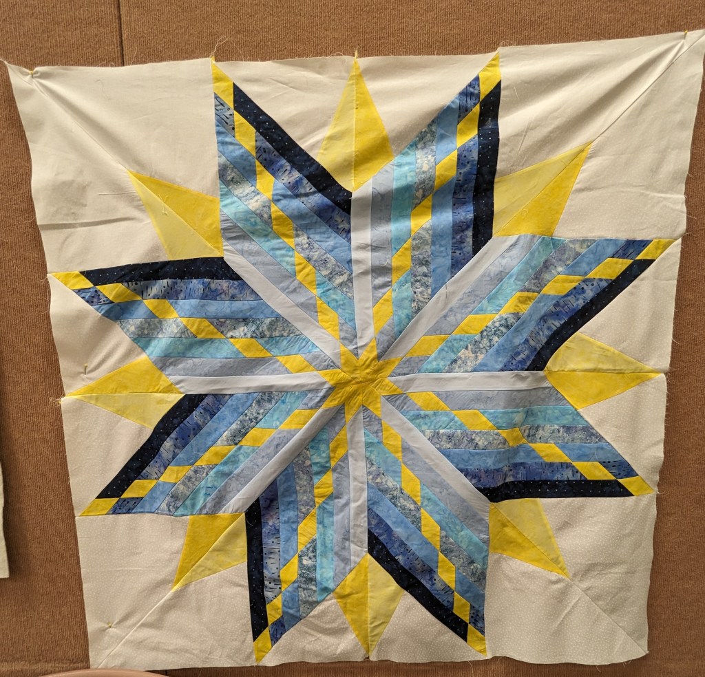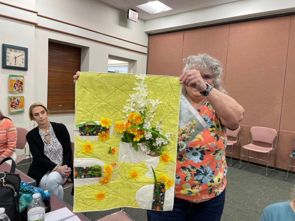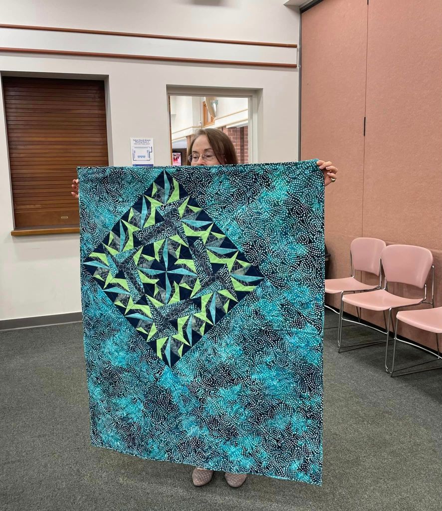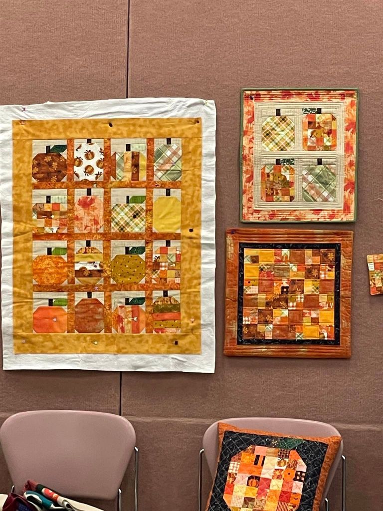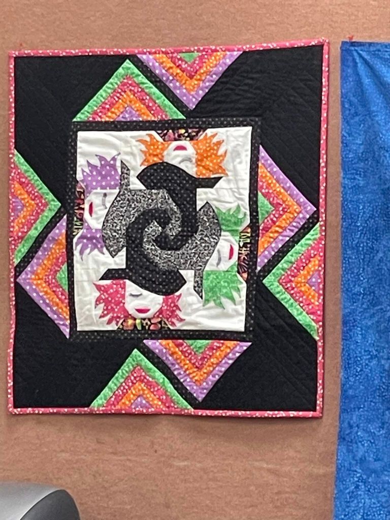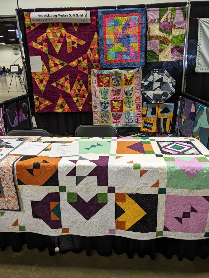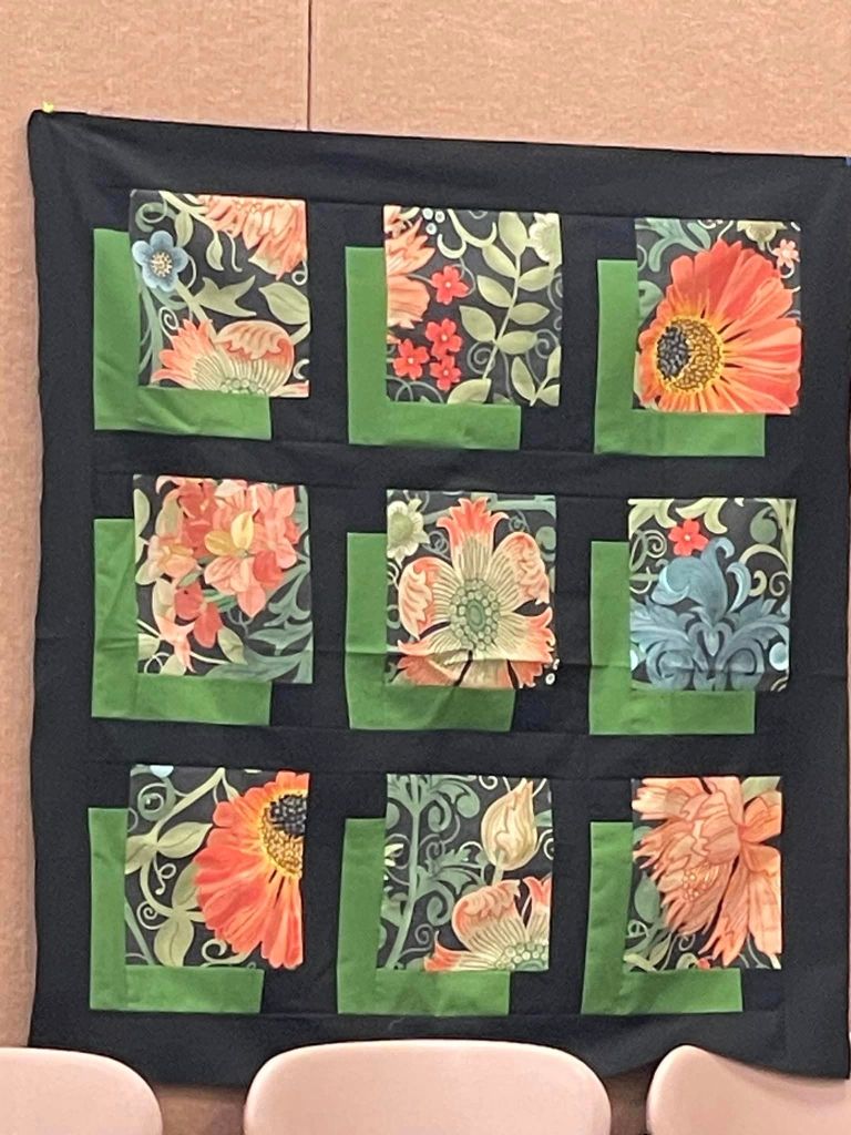 At the August meeting, we shared the quilt that we’ll be raffling at the Expo show. Thanks to everyone who made this happen: guild members who voted for the Eudaimonia quilt pattern, everyone who helped put it together, Karen for the gorgeous quilting and Carolyn for binding it and creating the beautiful label.