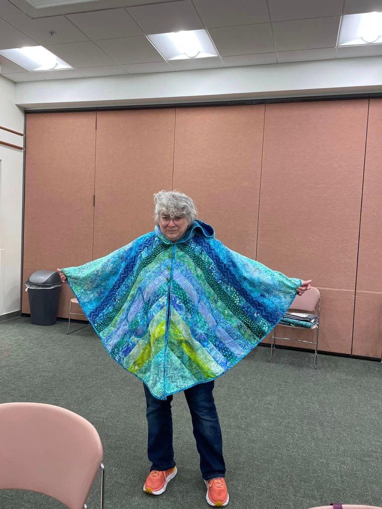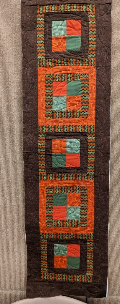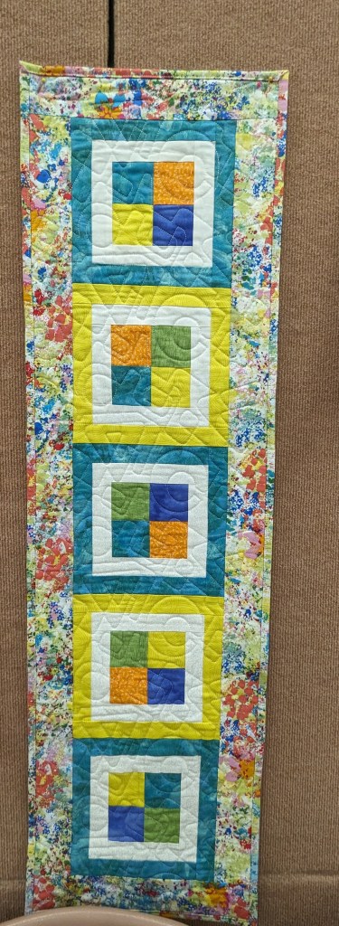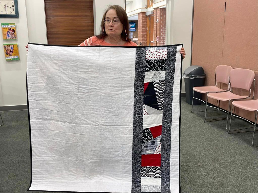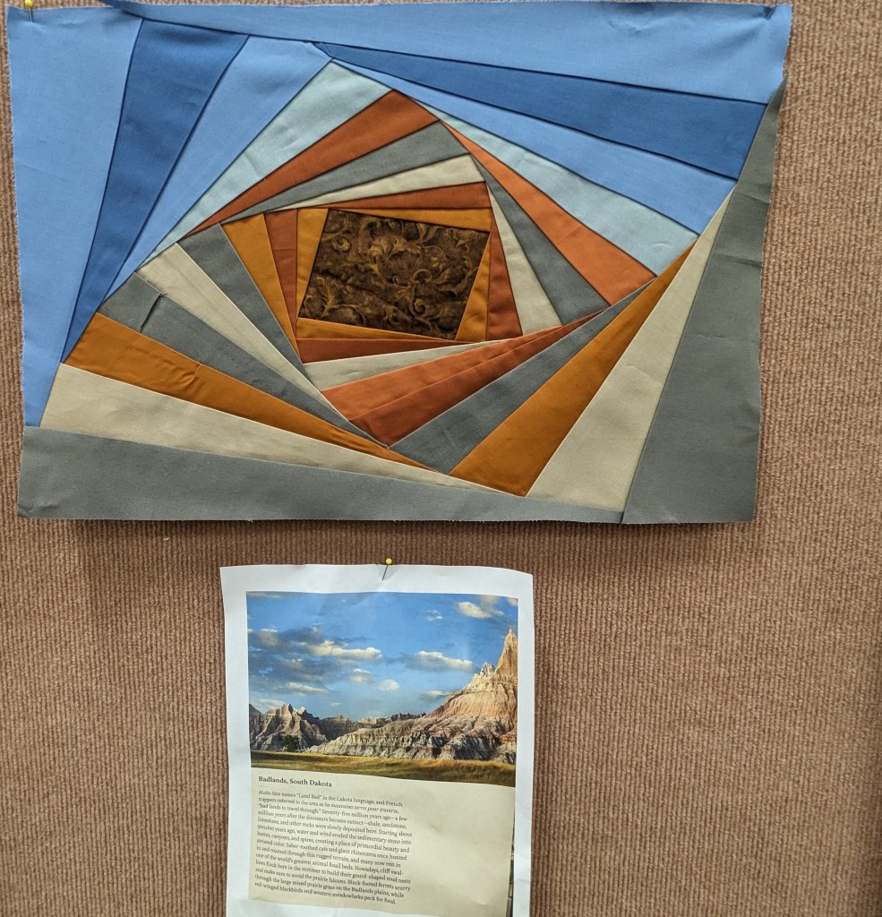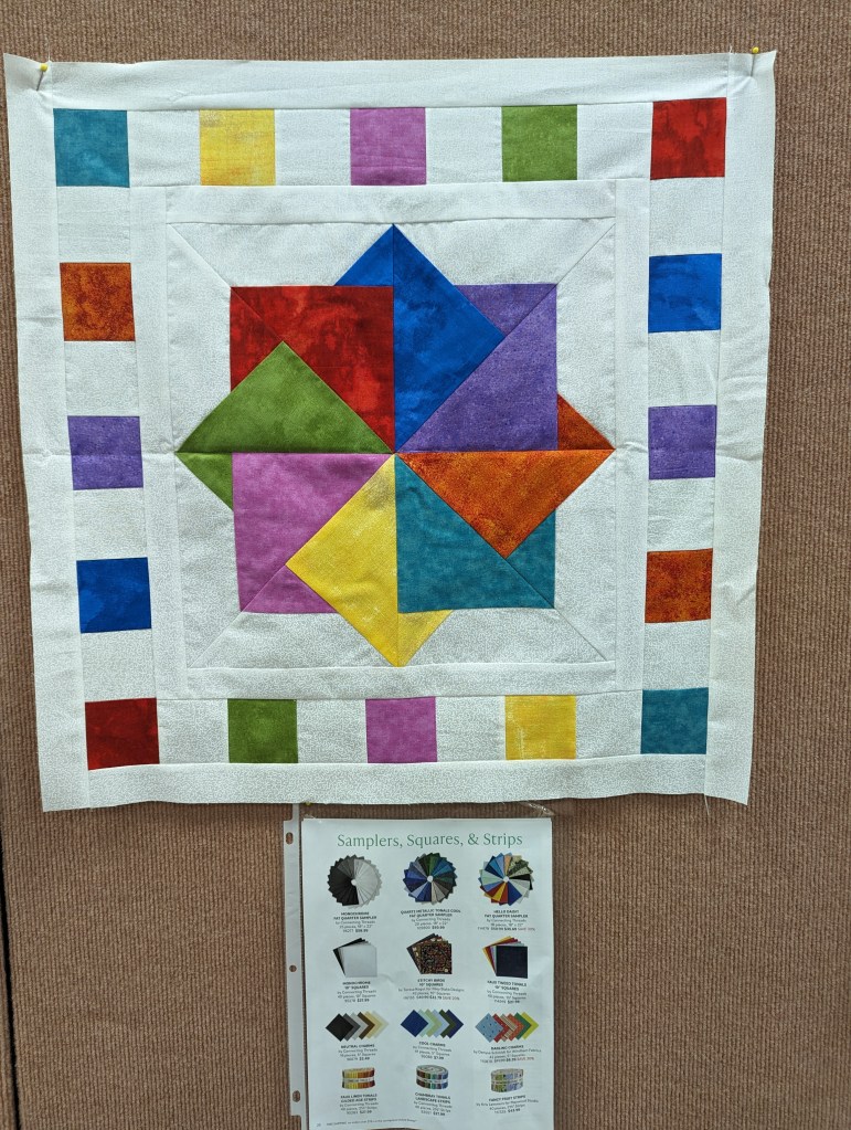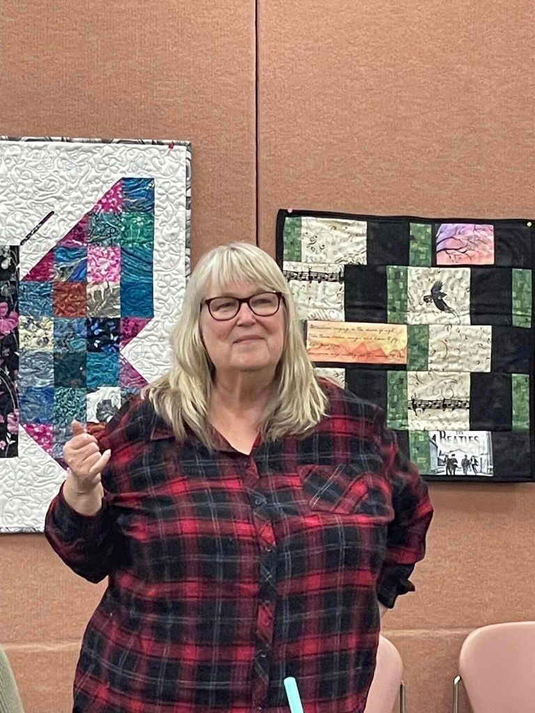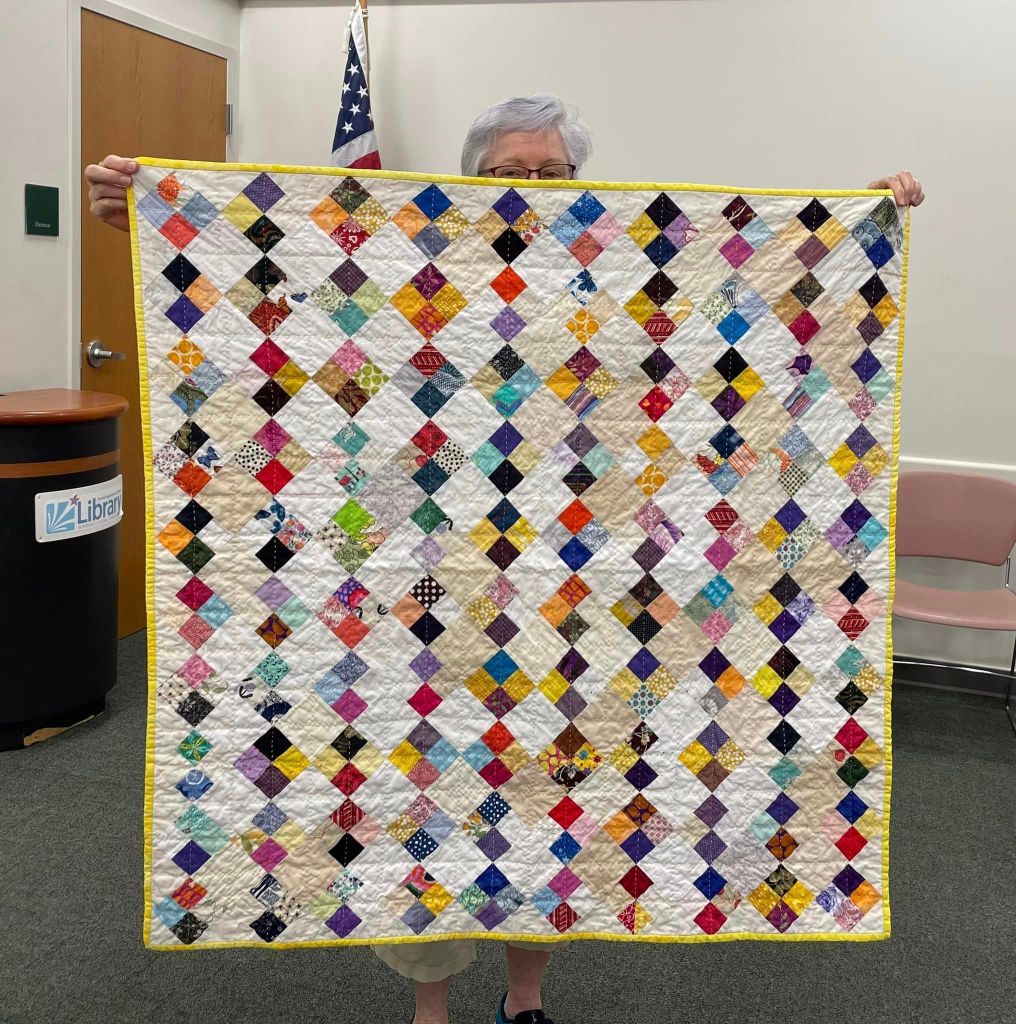 At the August meeting, we shared the quilt that we’ll be raffling at the Expo show. Thanks to everyone who made this happen: guild members who voted for the Eudaimonia quilt pattern, everyone who helped put it together, Karen for the gorgeous quilting and Carolyn for binding it and creating the beautiful label.