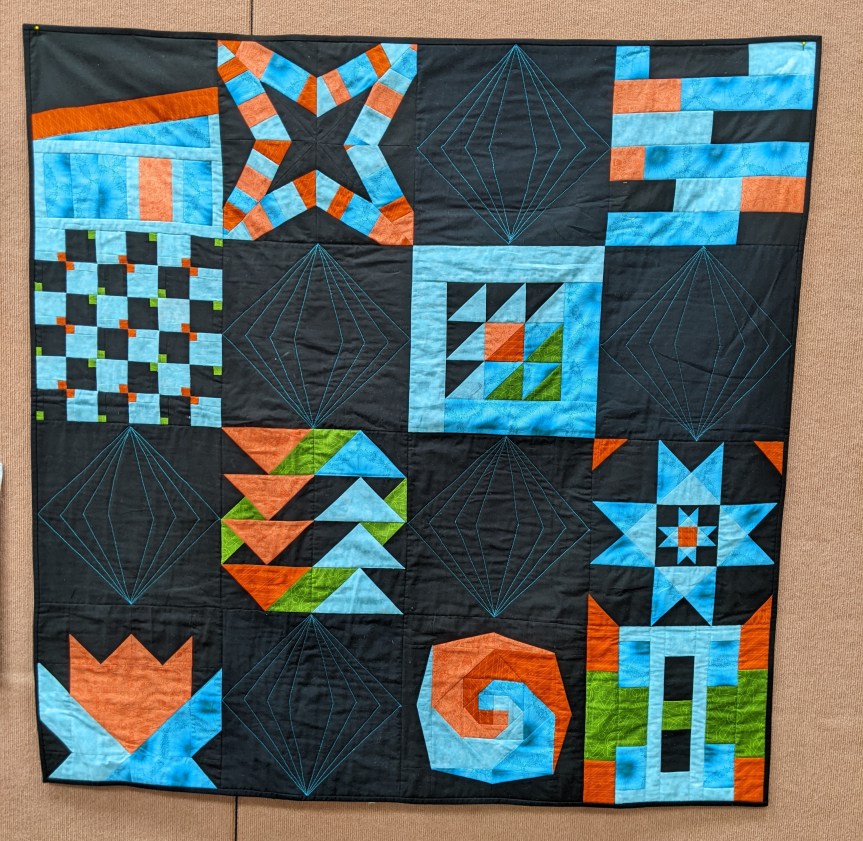 We are planning to enter a group/bee modern quilt at QuiltCon next year! If you’re interested in this project, please join us at the sew-in at 11:00 to discuss how we’ll proceed. We’ll need to talk about design, a color palette, and how to divvy up the creation of blocks or other elements of the quilt. Lots to chew on, so we may not nail it all down right away! Quilts can be entered between September 1 and October 31. This year’s winner is posted above, or see all the winners of the group/bee quilts at QuiltCon 2023 here (scroll down) for inspiration.